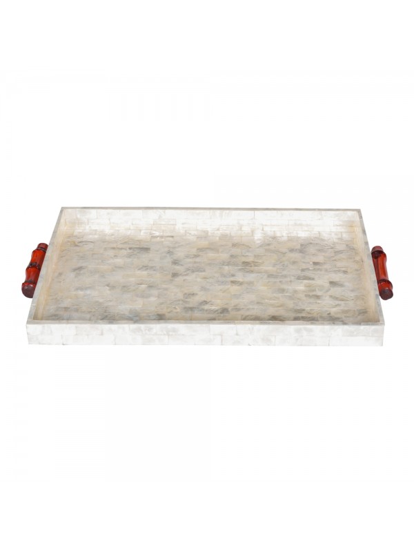 Bandeja de madre pérola com revestimento em resina, aplicação de bamboo tingido nas laterais.