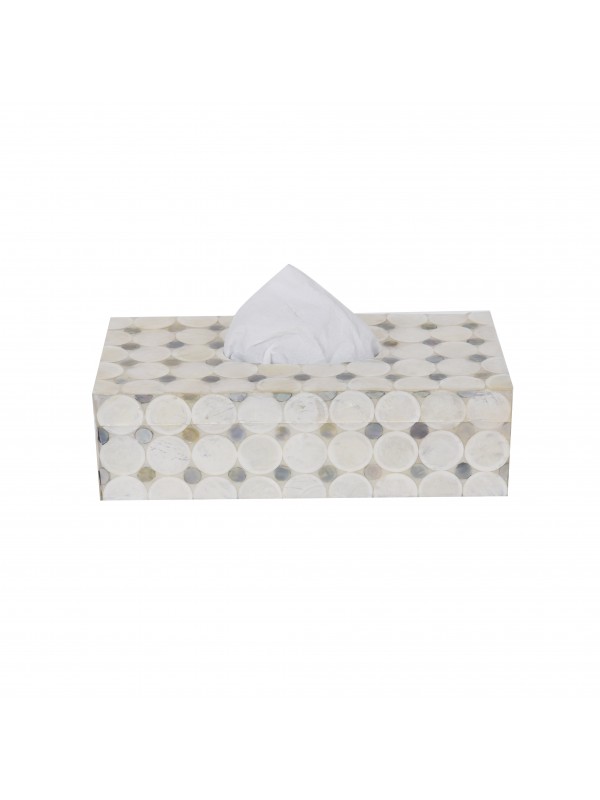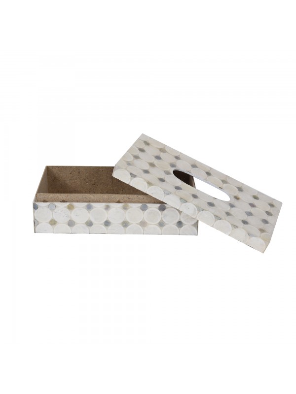 Caixa de lenço de madeira com tampa, revestida de madre perola e coberta com resina.