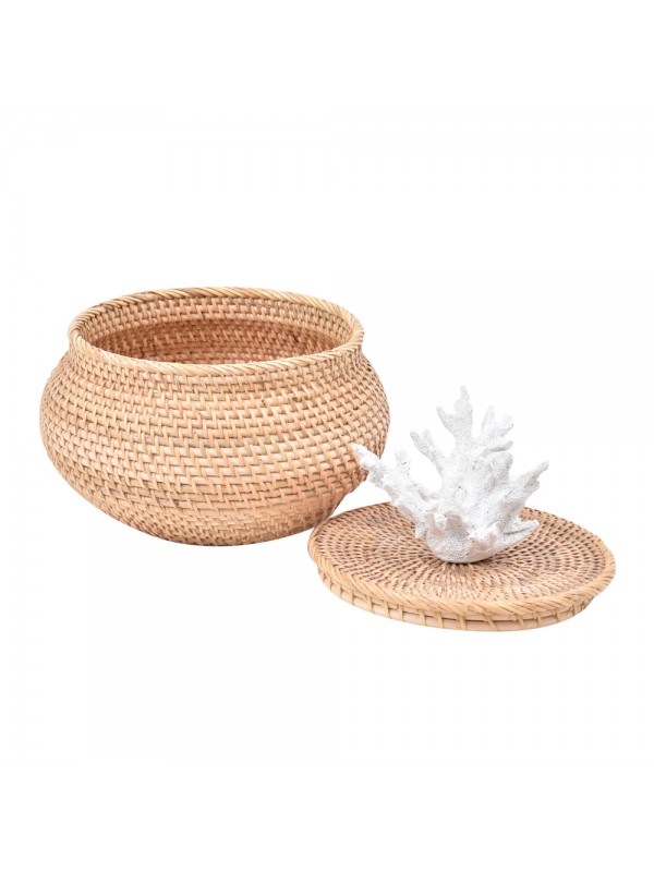 Caixa de ratan com tampa, com aplicação de coral em resina.