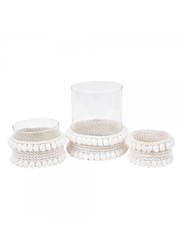 Cachepot com vidro, base em croche de algodão e aplicação de conchas naturais.