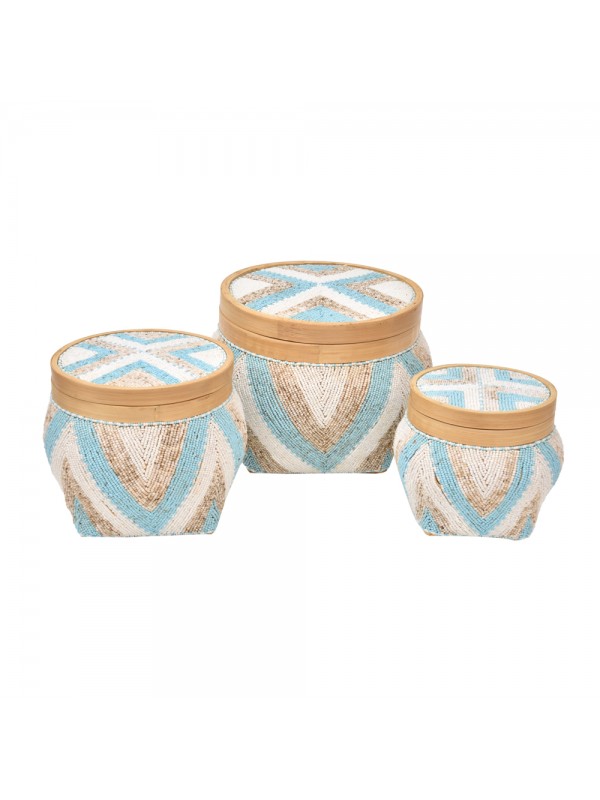 Caixa de bamboo, com tampa. Revestida em miçangas.