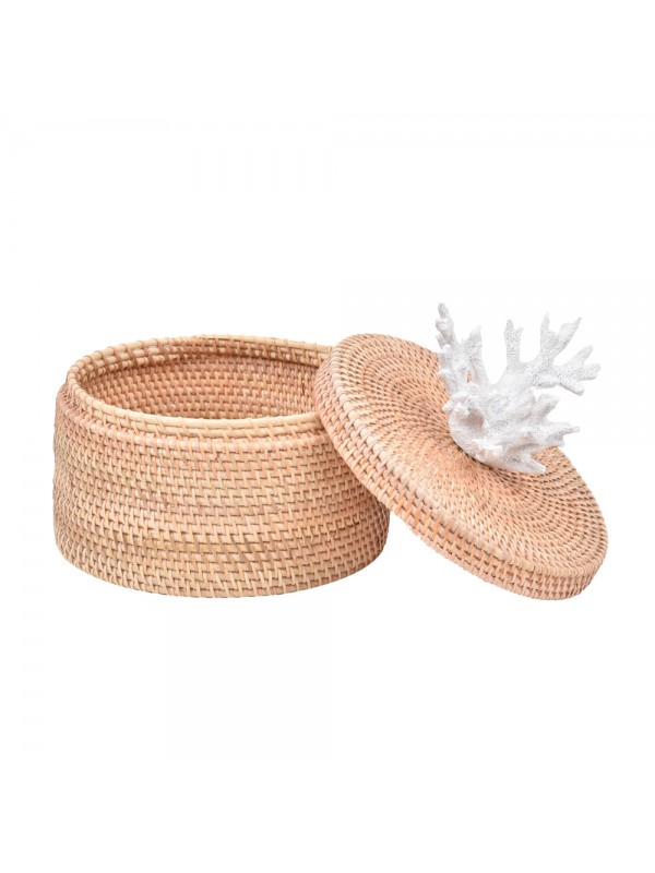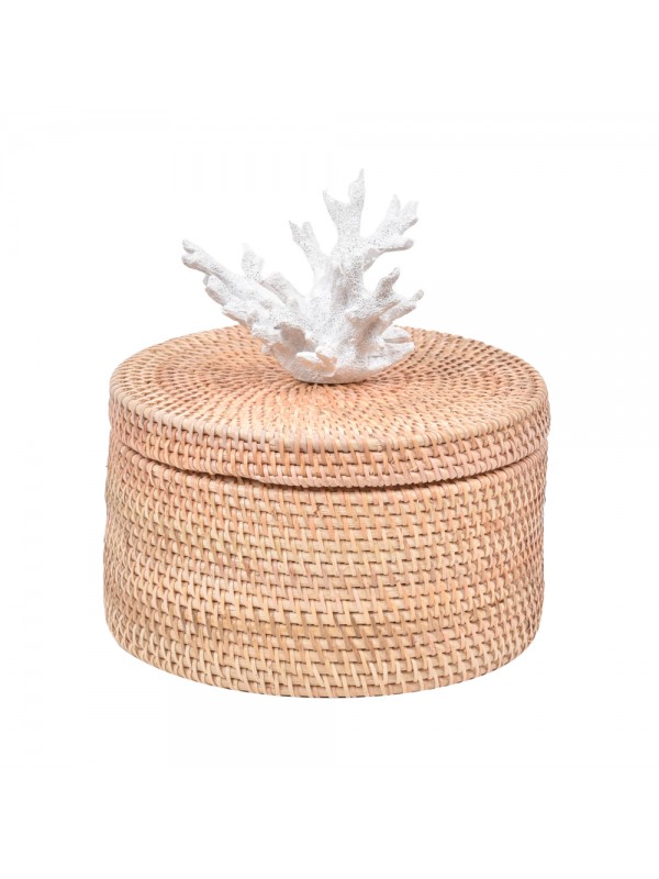 Caixa de ratan com tampa, aplicação de coral em resina.