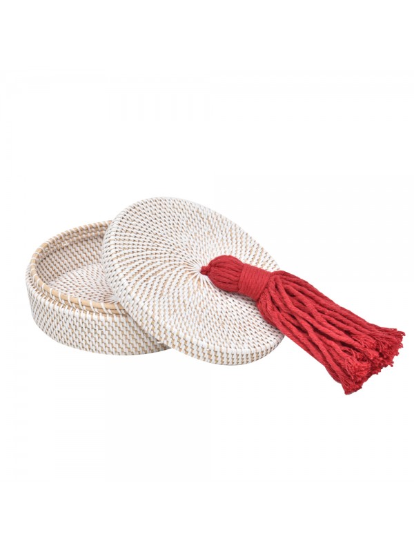 Caixa Redonda de Ratan patinado de Branco com Tassel de Algodão.