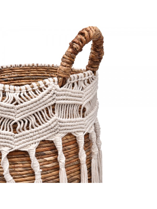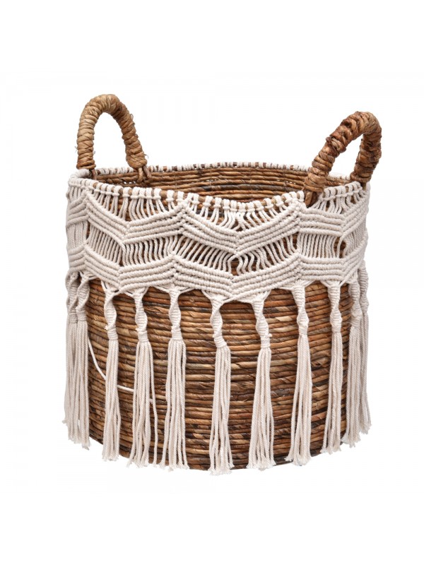 Cesto de fibra sintética em duas cores, acabamento final em bamboo e alças em corda. Dimensões: 20x40x30 Código 548GBRBG..