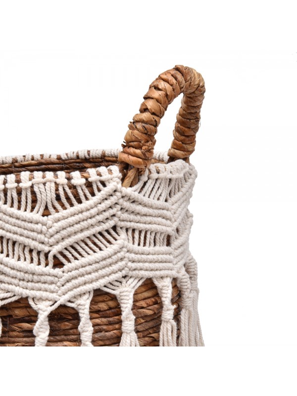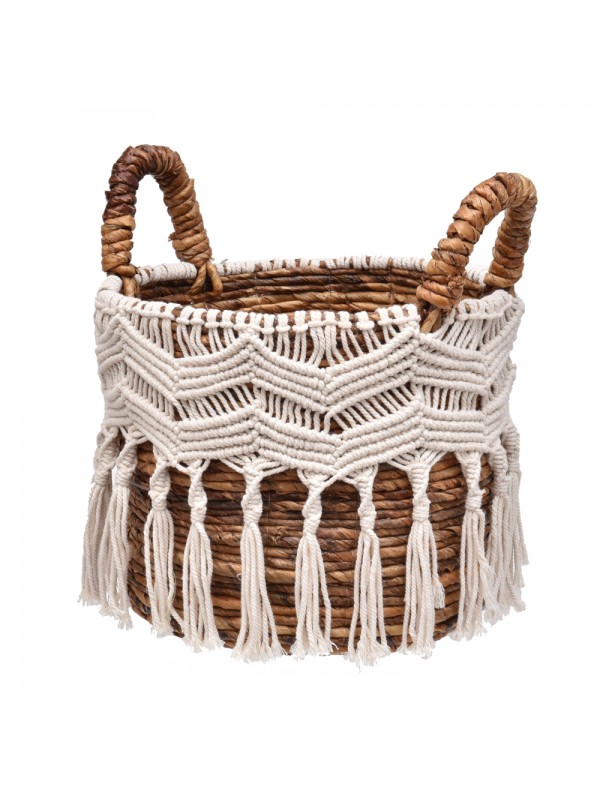 Cesto de fibra sintética em duas cores, acabamento final em bamboo e alças em corda. Dimensões: 20x40x30 Código 548GBRBG..