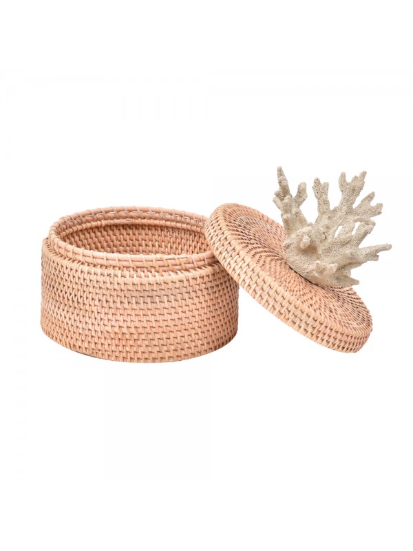 Caixa de ratan com tampa, aplicação de coral em resina.