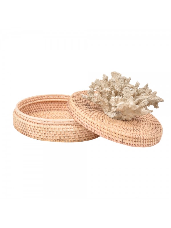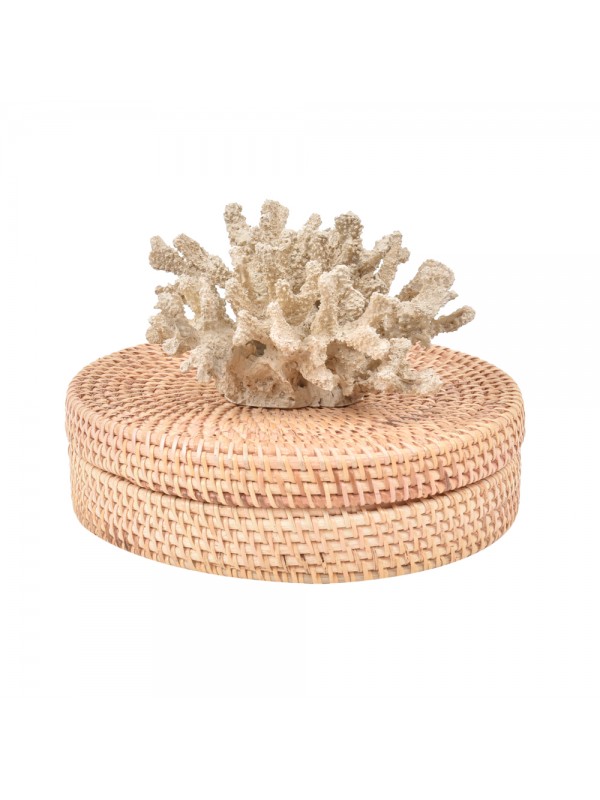 Caixa de ratan com tampa e aplicação de coral em resina na tampa.