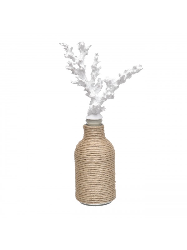 Garrafa de vidro revestida com fibra natural, aplicação de coral em resina na tampa.