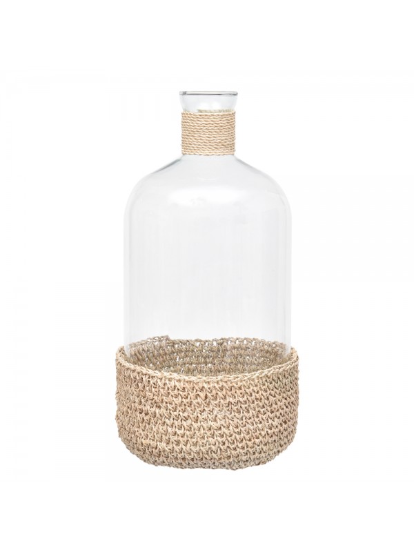 Garrafa de vidro revestido com fibra natural na boca, dentro de um cesto de fibra natural em croche.