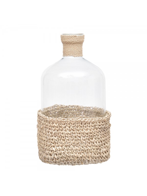 Garrafa de vidro revestido com fibra natural na boca, dentro de um cesto de fibra natural em croche.