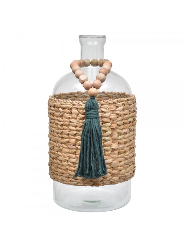 Garrafa de vidro com cinta em taboa, acompanha colar japamala com bolas em madeira e tassel em algodão.