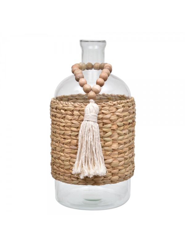 Garrafa de vidro com cinta em taboa, acompanha colar japamala com bolas em madeira e tassel em algodão.