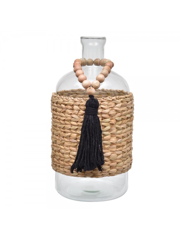 Garrafa de vidro com cinta em taboa, acompanha colar japamala com bolas em madeira e tassel em algodão.