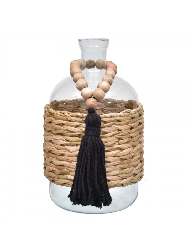 Garrafa de vidro com cinta em taboa, acompanha colar japamala com bolas em madeira e tassel em algodão.