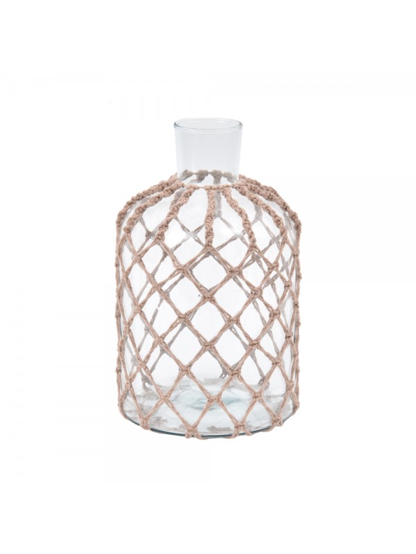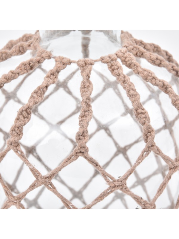 Garrafa de vidro revestida com macrame de fios de algodao.