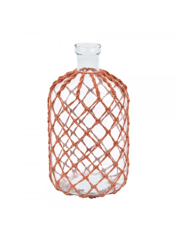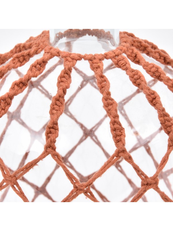 Garrafa de vidro revestida com macrame de fios de algodao.