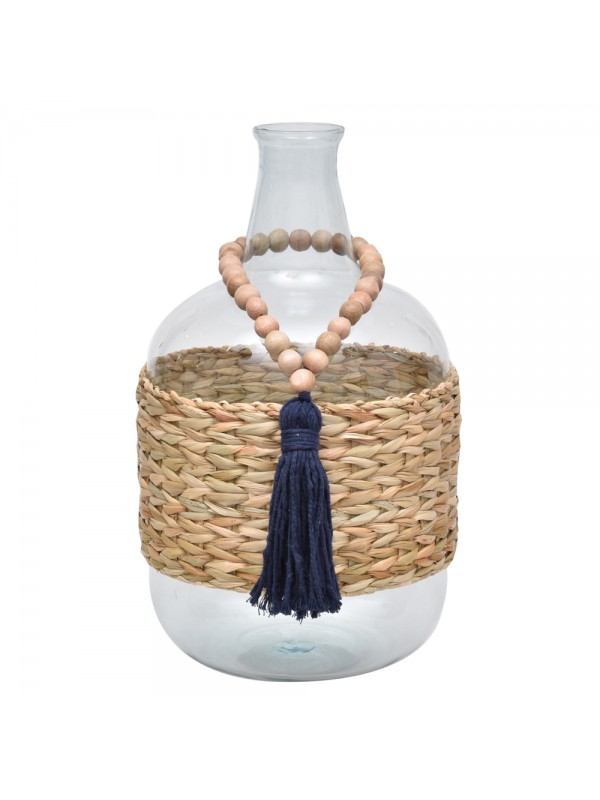 Garrafão de vidro, com cinta em taboa e pingente de madeira com tassel de algodao.