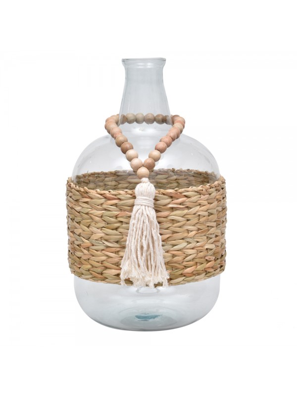 Garrafão de vidro, com cinta em taboa e pingente de madeira com tassel de algodao.