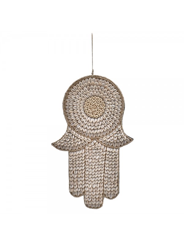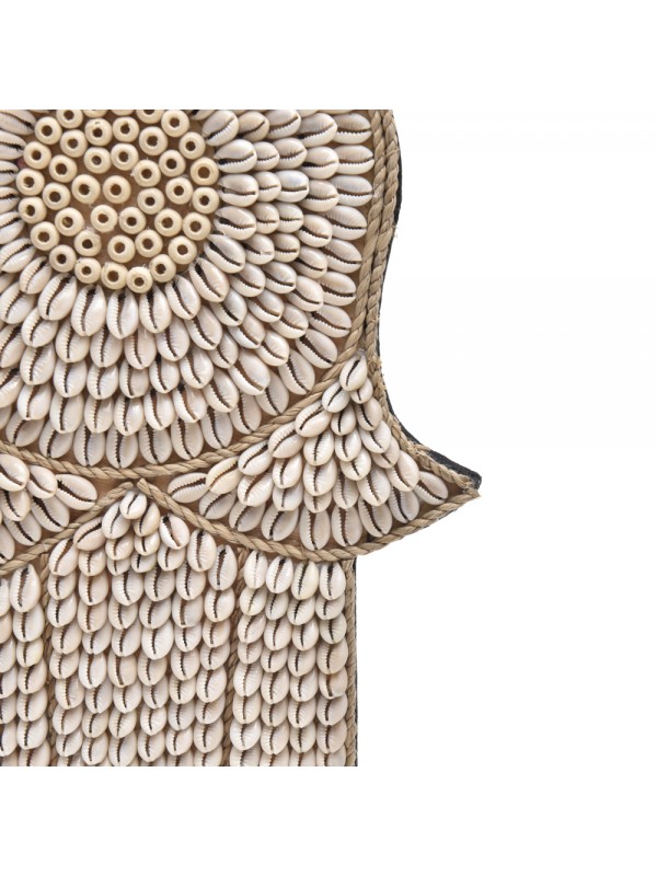 Mão de Hamsá, placa de madeira com aplicação de buzios naturais. Acabamento com fios de fibras naturais.
