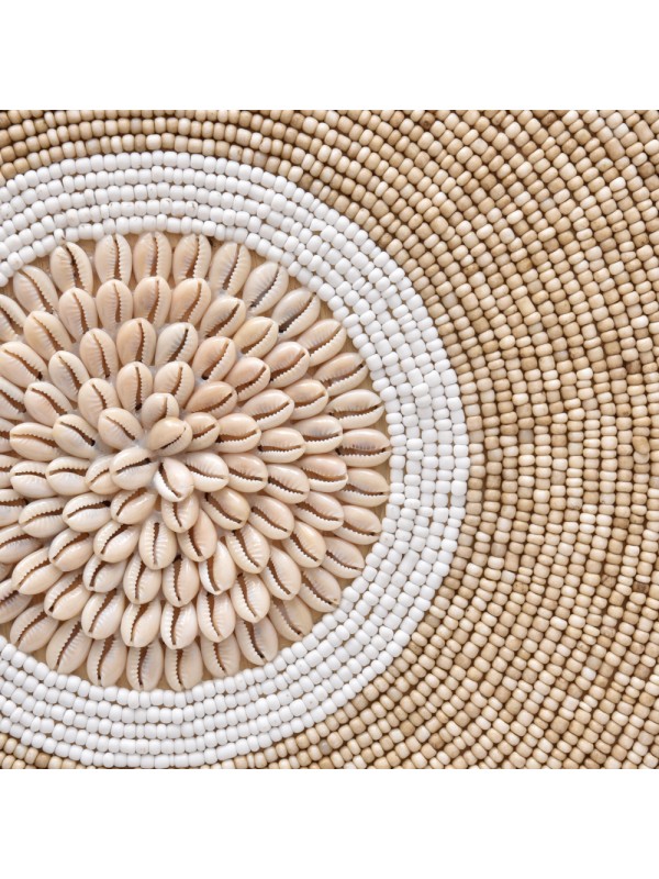 Disco de miçanga com detalhe em buzios naturais no centro e nas bordas. Acompanha pedestal de ferro. Conjunto com 3 peças.