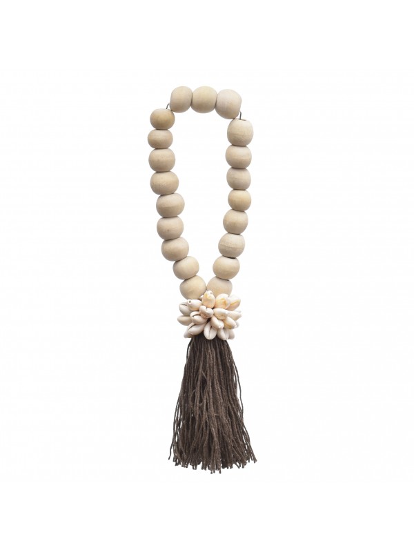 Pingente de bolas de madeira, com aplicação em buzios naturais e tassel em algodao.