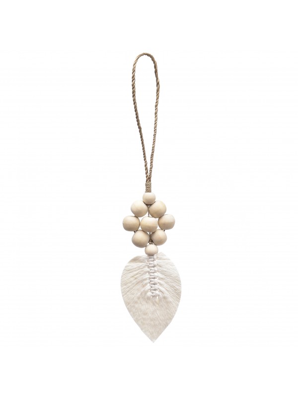 Pingente de fibra natural com bolas de madeira e folha em algodao.