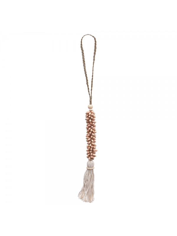 Pingente de fibra natural, com aplicação de conchas naturais.