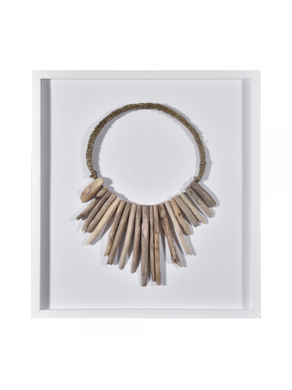 Quadro modelo caixa, com colar de fibra natural e pedaços de madeira.