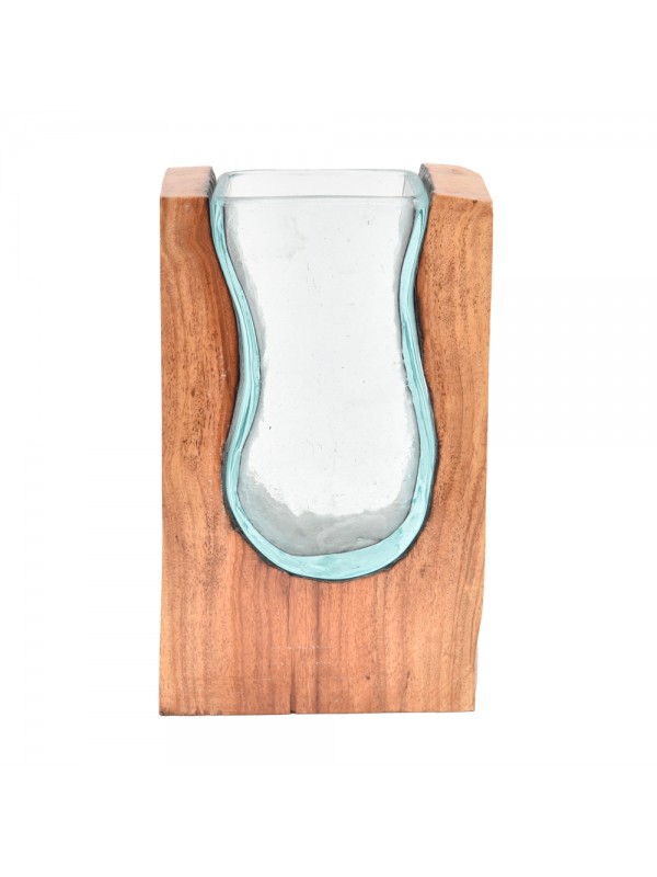 Vaso de madeira fatia retangular e vidro organico moldado exclusivamente na madeira.