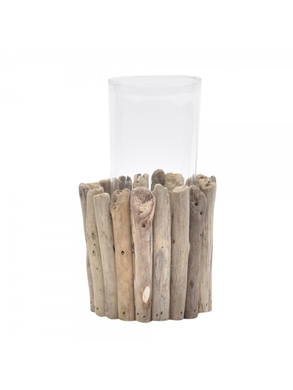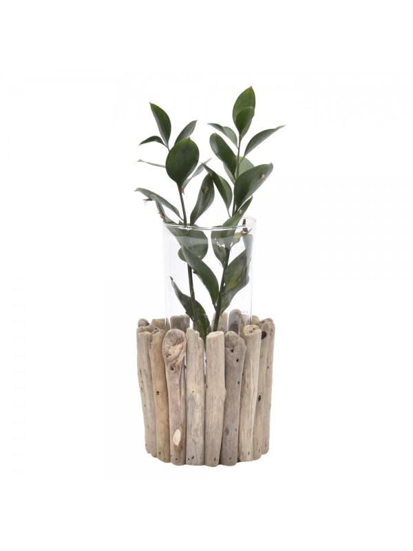Vaso de gravetos de madeira com tubo de vidro em seu interior.